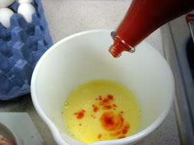 Beat the egg with 2 T of water and add the hot sauce. I added about 1/4 of hot sauce or until the mixture looks orange.