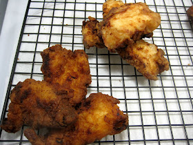 The bottom left pieces were double coated - dropped back into the buttermilk and another coating of flour